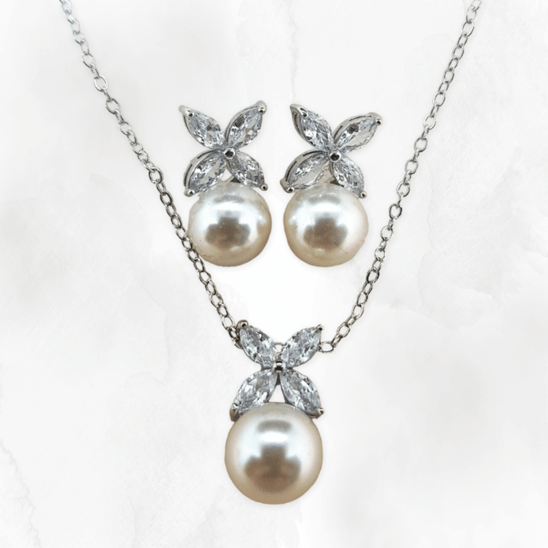 Juego en color plata con cristal austriaco, perla y baño de rodio.