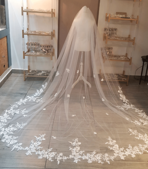 mantilla en color ivory en tul con aplicaciones de flores en el centro y en la cauda